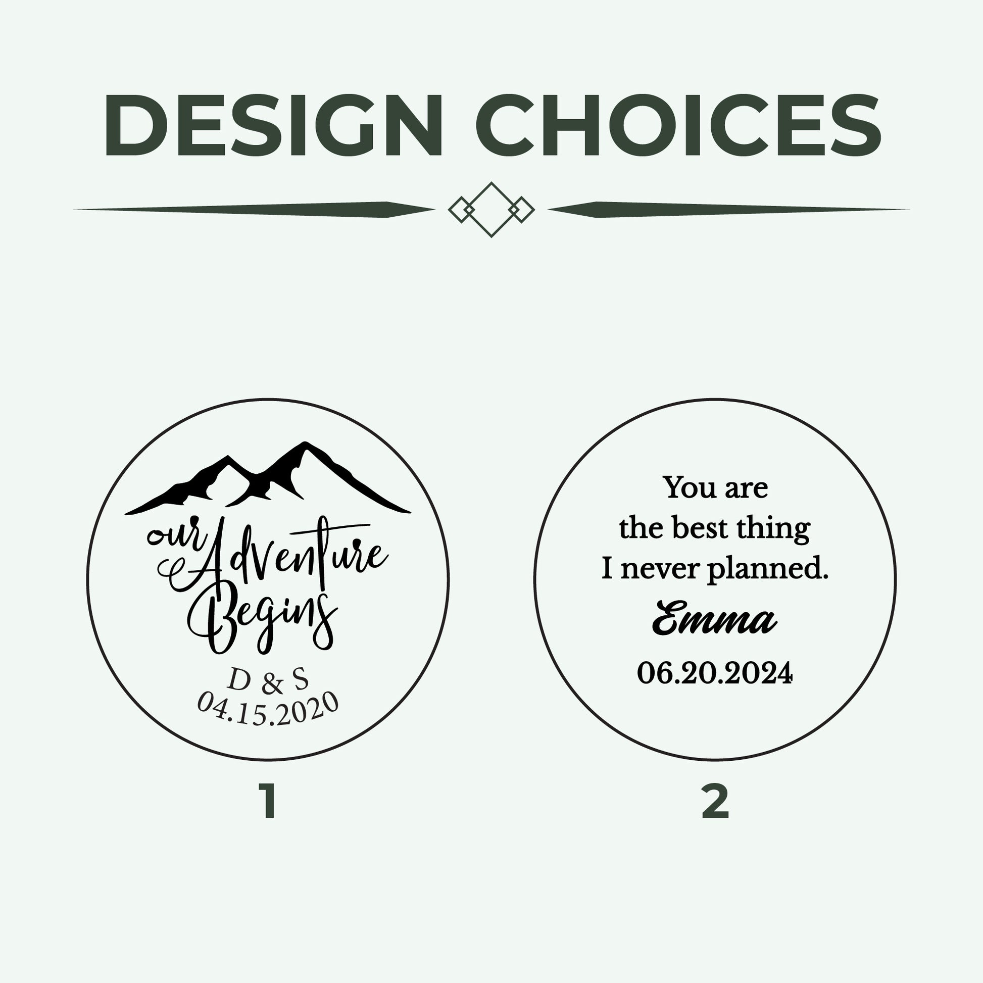 NOTE: The Mountain Design and the phrase "Our Adventure" are the default. If you don't want it, please leave us a note to let us know!